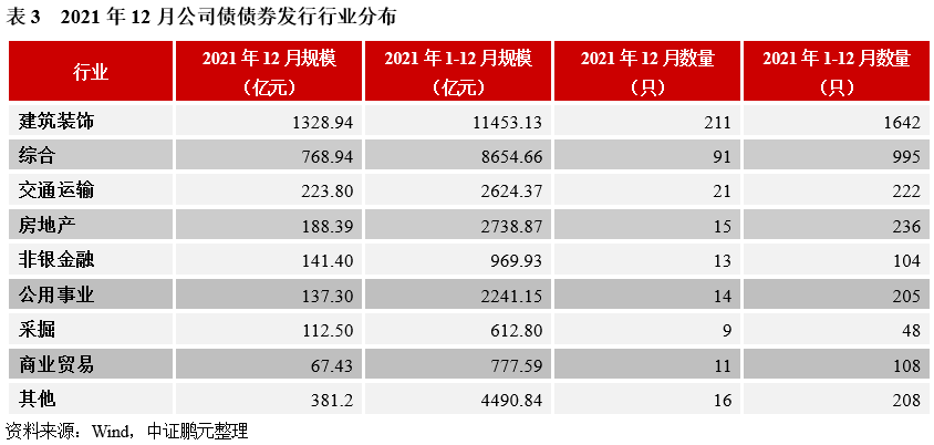 發行行業方面,12月份交易所公司債券的發行人主要分布在建筑裝飾和綜合行業。建筑裝飾行業發行211只,發行規模1,328.94億元,占比分別為53%和40%;綜合行業發行91只,發行規模769億元,占比分別為23%和23%。