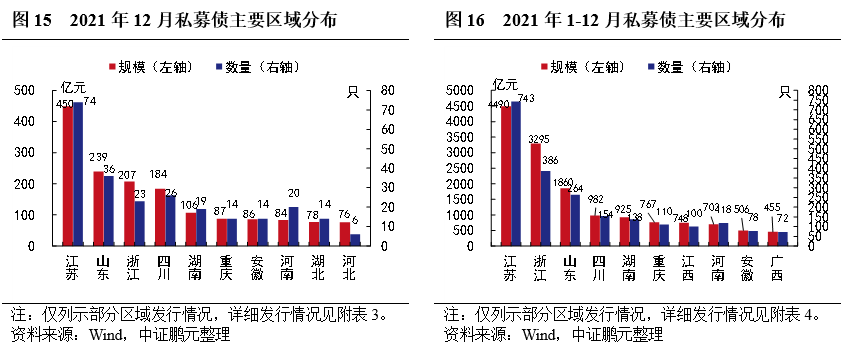 私募債券方面,2021年12月份,私募債券的發行人分布于26個地區,以江蘇、山東、浙江等地為主。從發行規模來看,江蘇發行449.76億元位居榜首,山東發行239.28億元位居第二,浙江發行207.08億元位居第三位,發行數量分別為74只、36只、23只。從凈融資來看,12月份江蘇、浙江、山東分別以凈融資196.71億元、151.08億元、150.44億元位于前三位,廣東、貴州、海南分別凈償還39.67億元、16.98億元、13.50億元。綜合1-12月,江蘇以發行743只、累計發行規模4,489.72億元位居首位,遠高于其地地區;浙江以發行386只、累計發行規模3,294.52億元位居第二;山東以發行264只、累計發行規模1,860.44億元位居第三;浙江、江蘇、山東分別以累計凈融資2,561.34億元、2,038.67億元、950.47億元位于前三位,北京、天津、上海分別凈償還495.34億元、452.00億元、314.94億元。
