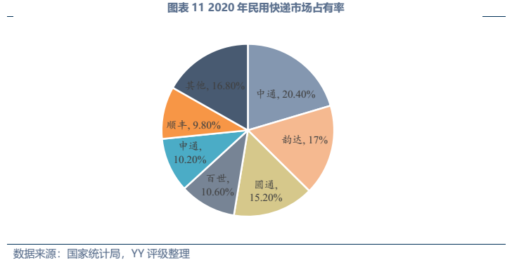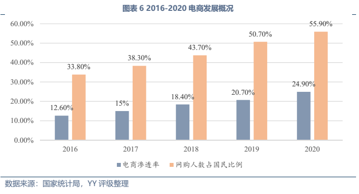 發(fā)展趨勢(shì)方面,傳統(tǒng)工業(yè)物流業(yè)務(wù)量上增長(zhǎng)空間不大,未來(lái)的發(fā)展大方向仍為降本增效(近幾年我國(guó)社會(huì)物流費(fèi)用/GDP徘徊在14.7%左右,較美國(guó)8%還有較大距離),同時(shí)物流企業(yè)通過(guò)向供應(yīng)鏈一體化延伸、提供附加服務(wù)來(lái)挖掘新的利潤(rùn)空間,與貿(mào)易、供應(yīng)鏈類企業(yè)的邊界日漸模糊。而居民快遞領(lǐng)域,業(yè)務(wù)量上還有較大增長(zhǎng)空間,其需求受電商滲透率、網(wǎng)購(gòu)人數(shù)占國(guó)民比例影響,截至20年末我國(guó)電商滲透率24.9%、網(wǎng)購(gòu)人數(shù)占比55.9%,還有較大增長(zhǎng)空間,且網(wǎng)購(gòu)的品類還在持續(xù)擴(kuò)大。