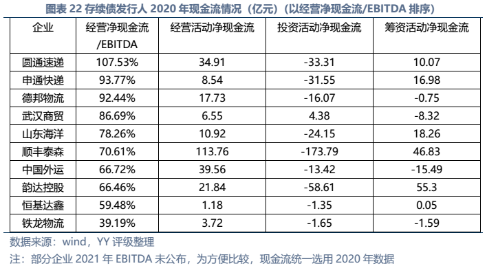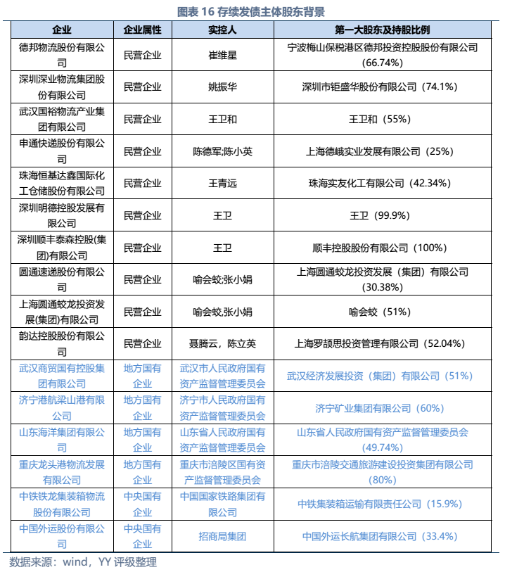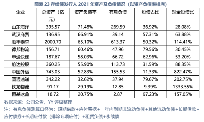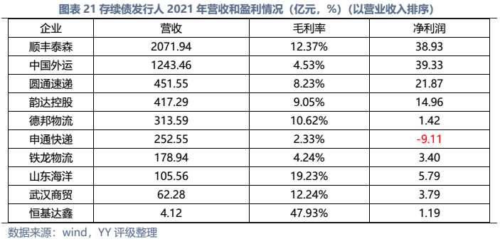信用債市場(chǎng)方面,上市公司中高頻出現(xiàn)的“多式聯(lián)運(yùn)”、“智慧物流”、“供應(yīng)鏈管理”等概念在發(fā)債主體中熱度不高,主要仍以傳統(tǒng)物流企業(yè)為主。截至22年3月末,YY行業(yè)為物流的存續(xù)債主體共有16家,債券余額合計(jì)為402.88億元。行業(yè)整體毛利率不高(平均13%),杠桿率偏低(平均資產(chǎn)負(fù)債51.3%)。資質(zhì)方面,貨代龍頭中國(guó)外運(yùn)信用資質(zhì)最好,中鐵鐵龍集裝箱背靠國(guó)鐵集團(tuán)資源,信用資質(zhì)也較好。快遞細(xì)分領(lǐng)域集中度較高,市場(chǎng)格局相對(duì)穩(wěn)定,也有較強(qiáng)的經(jīng)營(yíng)獲現(xiàn)能力支撐,順豐、韻達(dá)、圓通信用資質(zhì)尚可,申通快遞盈利較差,資質(zhì)稍弱。濟(jì)寧港航梁山港、珠海恒基達(dá)鑫、重慶龍頭港等工業(yè)品物流企業(yè)信用資質(zhì)較弱。