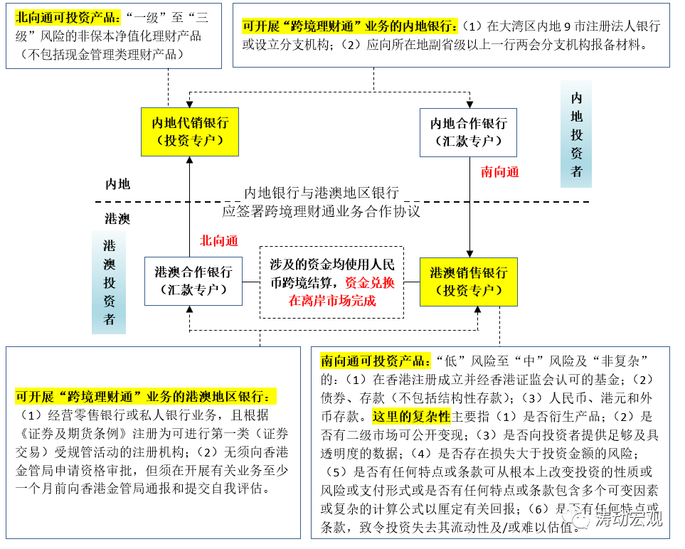 2、“跨境理財通”業(yè)務按照購買主體身份進一步分為北向通(即港澳投資者投內(nèi)地合格投資產(chǎn)品)和南向通(即內(nèi)地投資者投港澳合格投資產(chǎn)品),這和股市中的北向通和南向通內(nèi)涵是一致的。其中,北向通是指港澳地區(qū)居民通過大灣區(qū)內(nèi)地銀行開立投資專戶,購買內(nèi)地銀行銷售的投資產(chǎn)品;南向通是指大灣區(qū)內(nèi)地居民在港澳銀行開立投資專戶,購買港澳地區(qū)銀行銷售的投資產(chǎn)品。