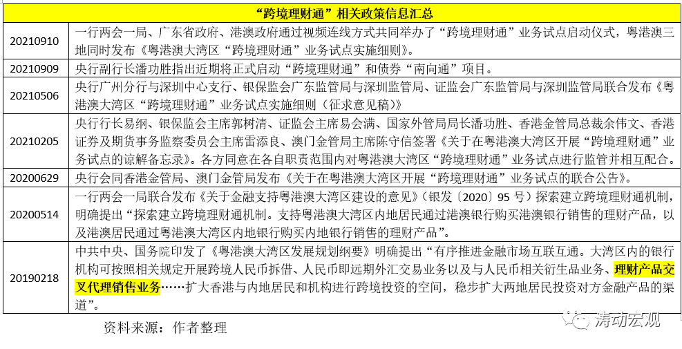 2021年9月10日,一行兩會一局、廣東省政府、港澳政府舉辦“跨境理財通”業(yè)務試點啟動儀式,同時粵港澳三地亦同時發(fā)布了《粵港澳大灣區(qū)“跨境理財通”業(yè)務試點實施細則》,意味著自今年5月6日發(fā)布征求意見稿以來,跨境理財通業(yè)務已經(jīng)進入實操環(huán)節(jié),即大灣區(qū)內(nèi)的投資者可通過當?shù)劂y行跨境購買對方銀行銷售的合資格投資產(chǎn)品。這是繼針對股市的滬深港通(分為北向通和南向通)、針對債市的北向債券通(南向債券通也即將啟動)、基金互認以及開展港澳代理見證開立內(nèi)地個人銀行賬戶試點和自由貿(mào)易(FT)賬戶試點之后的又一重要舉措,意味著大灣區(qū)金融市場的互聯(lián)互通程度進一步加深。