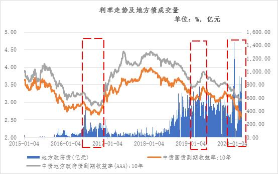 地方債一級發行對二級交易量影響,主要體現在兩個方面,一是地方債票面利率改革;二是地方債發行節奏改革。所謂票面利率改革,即2018年8月財政部下達《關于做好地方政府專項債券發行工作的意見》(以下簡稱《意見》),各省市地方債票面利率錨定在國債基準+40BP。由本圖即可發現,自該文件頒布后,地方債二級成交活躍度快速上行。畢竟,在國債基準上浮40BP,與當時二級估值相比,存在較大套利空間。很多機構一級獲配之后,二級直掛OFR,穩穩套利收益到手,這也在短期內催發了地方債的二級交易熱度。但在2019年1月,財政部調低了地方債上浮空間,由40BP改為25BP,當月地方債一級發行規模呈現上行趨勢,但二級交易規模卻當即回落。足見票面利率對地方債一二級套利所帶來影響,會明確傳遞至二級市場交易量,甚至影響權重強于一級發行市場。
