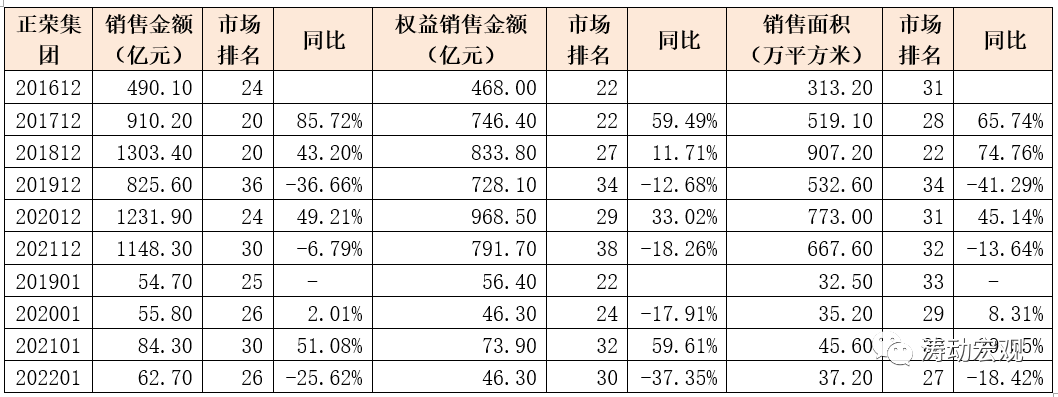 特別是若從2021年全年和2022年1月的銷售數據來看,正榮銷售端的壓力均比較突出,如銷售金額同比分別下滑6.79%和25.62%,權益銷售金額同比分別下滑18.26%與37.35%,銷售面積同比分別下滑13.64%與18.42%。
