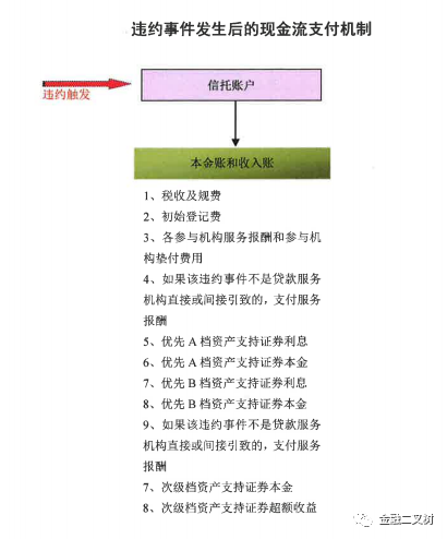上圖所示產品有A、B檔兩個層級及次級,當出現違約事件后,償付順序是優先A檔本金、利息 優先B檔本金、利息 次級本金及超額收益。當優先A檔本息正常兌付時,而B檔本息無法正常兌付時,優先B檔發生實質違約,而當次級本金損失,而優先A、B檔正常兌付本息時,小編認為沒有發生實質違約,風險事件會影響現金流分配但不一定導致違約。