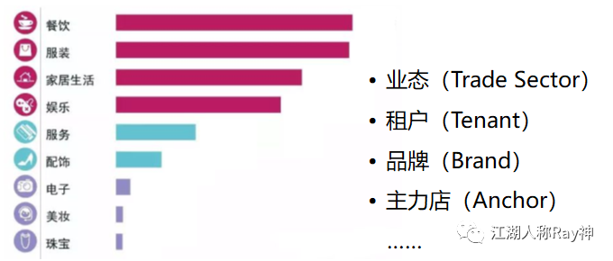 商場入駐品牌的業態構成,體現為不同業態的租賃面積占比,即:∑某業態的租賃面積 / 項目可租賃面積;也有企業從不同業態的租金收入占比進行評價的,即:∑某業態的租金收入 / 項目租金總收入。對于辦公樓宇,通常叫行業構成。