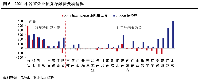 從地區(qū)分布看,2021年企業(yè)債凈融資依然呈現(xiàn)兩極分化,其中,8個(gè)省份凈融資為正,另有8個(gè)省份本年度尚未發(fā)行企業(yè)債。具體來看,浙江實(shí)現(xiàn)凈融資398.01億元,遠(yuǎn)高于其他省份,其次是湖北和四川分別實(shí)現(xiàn)凈融資281.57億元和273.51億元,位居第二、第三。此外,上海因償還規(guī)模較小,實(shí)現(xiàn)凈融資規(guī)模99.87億元,位居第四。而江蘇因償還規(guī)模較大,凈融資規(guī)模為-184.87億元。青海、甘肅、黑龍江、海南、內(nèi)蒙古、山西、遼寧和西藏本年未發(fā)行企業(yè)債,其中遼寧省累計(jì)償還109.51億元,償還規(guī)模較大。與2020年相比,12個(gè)省份凈融資規(guī)模出現(xiàn)增長(zhǎng),18個(gè)省份出現(xiàn)下降,其中,浙江和四川凈融資規(guī)模明顯增長(zhǎng),貴州、安徽和陜西的凈融資較上年出現(xiàn)明顯下降。北京、江蘇、湖南、湖北等省份,2022年待償還企業(yè)債規(guī)模較大,需關(guān)注償還壓力較大,且2021年凈融資出現(xiàn)下滑的地區(qū)。