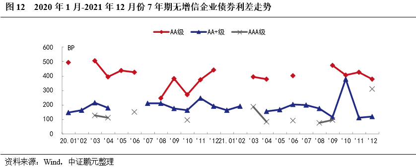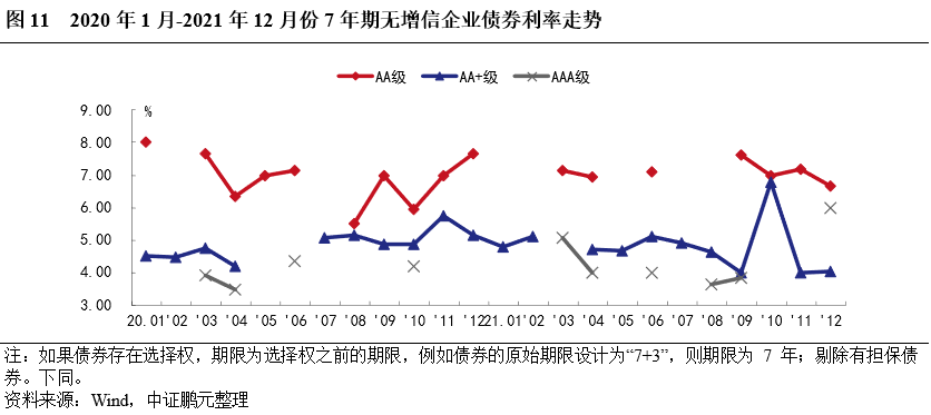 2021年,企業(yè)債券最高發(fā)行利率為8.00%,與上年下降50BP;最低發(fā)行利率為3.05%,較上年上行66BP。分債券級(jí)別來看,與上年相比,各級(jí)別企業(yè)債平均發(fā)行利均下行,平均發(fā)行利差均收窄,其中AA和AA+級(jí)較AAA級(jí)降幅較大。