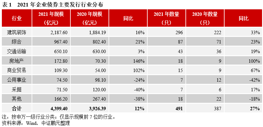 2021年,企業(yè)債券發(fā)行人主要分布在建筑裝飾、綜合等行業(yè)。其中,建筑裝飾發(fā)行規(guī)模遠(yuǎn)高于其他行業(yè),占比50%,較上年增長(zhǎng)1.7個(gè)百分點(diǎn);其次,綜合行業(yè)發(fā)行規(guī)模占比20%,較上年下降1.5個(gè)百分點(diǎn);交通運(yùn)輸行業(yè)規(guī)模占比16%,較上年增長(zhǎng)1.27個(gè)百分點(diǎn)。從發(fā)行規(guī)模增速看,2021年房地產(chǎn)和商業(yè)貿(mào)易行業(yè)的發(fā)行規(guī)模漲幅較大,分別為100%和67%,公用事業(yè)類規(guī)模出現(xiàn)下降。