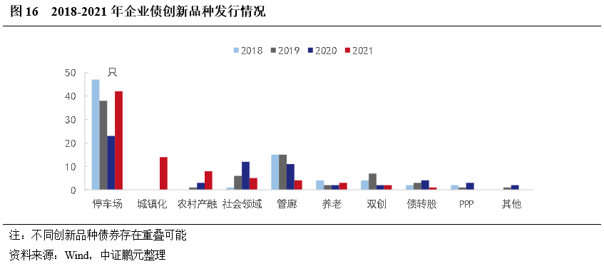 從募集資金用途看,棚改、安置房等安居工程是企業(yè)債的主要投向,占比23%左右,其次是產(chǎn)業(yè)園相關(guān)項(xiàng)目2021年出現(xiàn)明顯增加,數(shù)量占比17%,軌道交通和停車場(chǎng)項(xiàng)目占比也相對(duì)較高,各占9%。此外,2020年來,借新還舊和全額補(bǔ)充運(yùn)營(yíng)資金(扣除相關(guān)發(fā)行費(fèi)用后)明顯增加。結(jié)合創(chuàng)新品種看,除停車場(chǎng)長(zhǎng)期以發(fā)行專項(xiàng)債為主外,生態(tài)、城市環(huán)境治理領(lǐng)域發(fā)行創(chuàng)新品種的占比也較高,主要為綠色債,軌道交通和管網(wǎng)領(lǐng)域創(chuàng)新品種也較多,其他領(lǐng)域中創(chuàng)新品種較少。