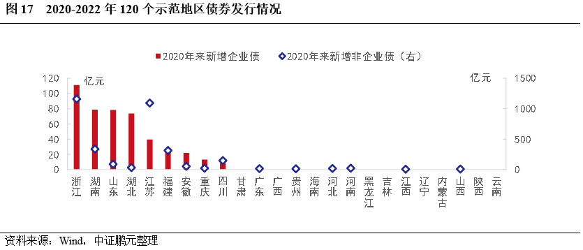 2022年,將加快示范項(xiàng)目推廣,以及推動(dòng)示范區(qū)的建設(shè),在支持方面,嚴(yán)格執(zhí)行前期政策,優(yōu)先具備落地條件的項(xiàng)目。劇不完全統(tǒng)計(jì),120個(gè)縣城新型城鎮(zhèn)化建設(shè)示范區(qū),2020年-2021年共有148家城投公司(根據(jù)注冊(cè)地)發(fā)行債券融資,其中,企業(yè)債450.50億元,占比11.9%,2020年和2021年分別發(fā)行204億元和246.50億元。2020年-2021年,120個(gè)示范地區(qū)中共有32個(gè)城市發(fā)行企業(yè)債,分布在浙江、山東、湖南和湖北等9個(gè)省份,其中浙江、湖南、湖北和山東四省新增債券規(guī)模合計(jì)占比75.87%,其余15個(gè)省份未有新增企業(yè)債。從省內(nèi)情況看,除浙江、山東、湖北和江蘇省內(nèi)有融資較為分散,其他地區(qū)融資集中在1-2個(gè)城市。整體看,2021年企業(yè)債規(guī)模較上年增長(zhǎng)20.83%,但示范縣融資分化明顯。短期內(nèi),仍將以發(fā)達(dá)地區(qū)為主,加快形成可以推廣的示范案例。同時(shí),建議制定動(dòng)態(tài)考核機(jī)制,切實(shí)推動(dòng)城市規(guī)劃和項(xiàng)目落地,并提高資金使用效率。
