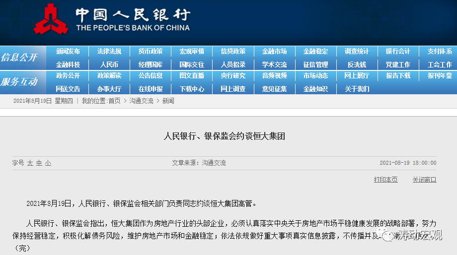 (一)2021年8月19日,央行和銀保監會官網發文“人民銀行、銀保監會約談恒大集團”。這算是金融管理部門首次給談地產企業并進行官網披露,表明恒大事件目前可能已經超出了政策部門的容忍范圍。