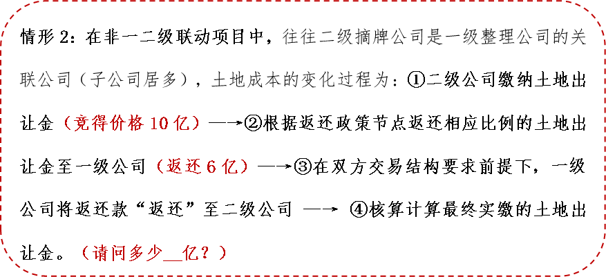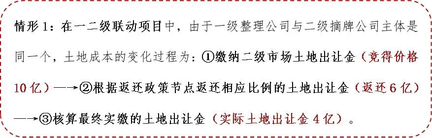 需要說明的是,土地成本的認定其實也是對稅負抵扣計算基數的認定。在一二級聯動項目中,由于出資主體與返還主體為同一主體,在稅負的抵扣中視為“土地出讓金返還在原土地成本中進行沖抵”。