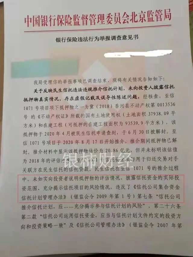 9月份,筆者曾報(bào)道過(guò)民生信托旗下置信316號(hào)出現(xiàn)風(fēng)險(xiǎn)的情況,來(lái)自北京銀保監(jiān)局出具的《舉報(bào)調(diào)查意見(jiàn)書》中顯示,該產(chǎn)品未向投資人進(jìn)行信息披露,信托資金運(yùn)用與信托合同定不符等等。并且責(zé)令民生信托進(jìn)行整改問(wèn)責(zé),后續(xù)將依法進(jìn)一步采取行動(dòng)。