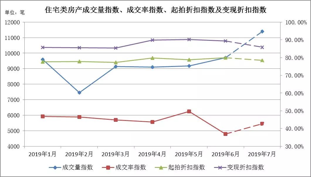 七月預測:成交量在299至348筆左右,成交率指數區間[30.56%,33.42%],起拍折扣指數區間[73.01%,74.64%],變現折扣指數區間[86.01%,91.91%]。