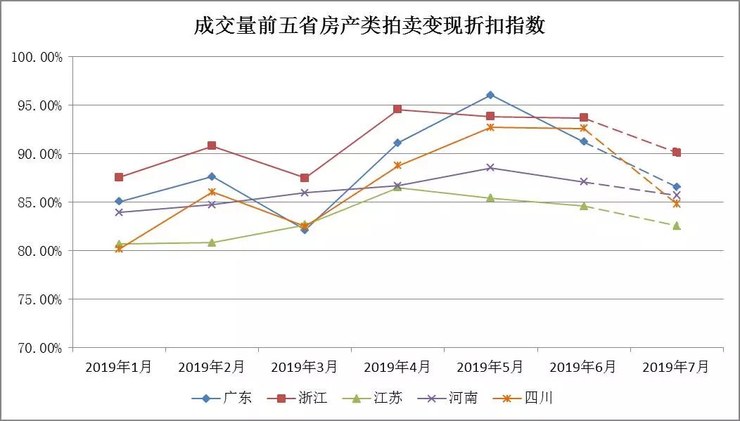 廣東、浙江、江蘇穩居房產類拍賣品成交量前三,本月四川省成交量進入前五;前五省的成交率指數與變現折扣指數均明顯下降,說明前五省的拍賣房產流動性與市場投資認可度都在降低。