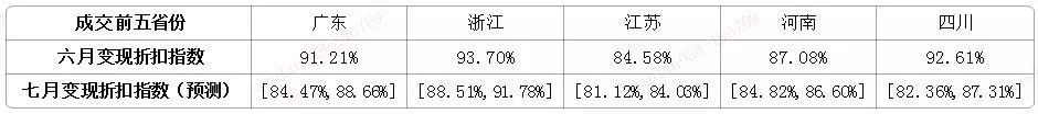 七月預測:成交量在302至357筆左右,成交率指數區間[21.46%,22.57%],起拍折扣指數區間[77.51%,78.76%],變現折扣指數區間[99.41%,106.55%]。