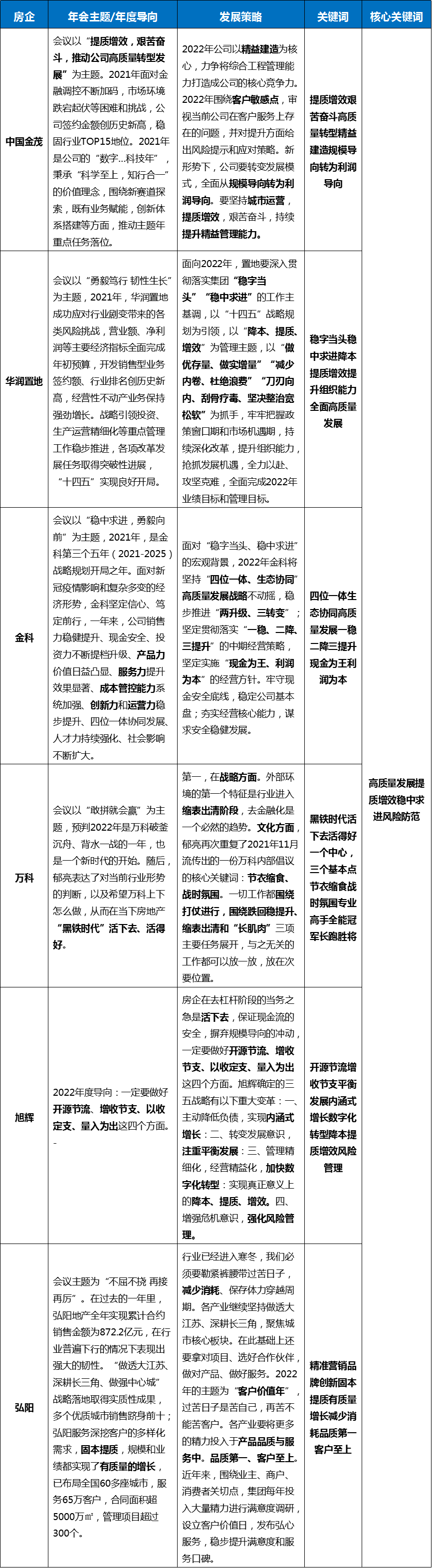 通過對已經釋放信息的優秀大中型房企、G50會員企業、其他中小型房企年會主題的跟蹤和分析,可以明確看出行業深度調整下各房企的經營對策調整共識——基本圍繞“穩”,著手降本提質增效、高質量發展、促進科技數字轉型,強化產品、服務和組織能力的提升、強調控制風險的思路展開2022年的經營對策。