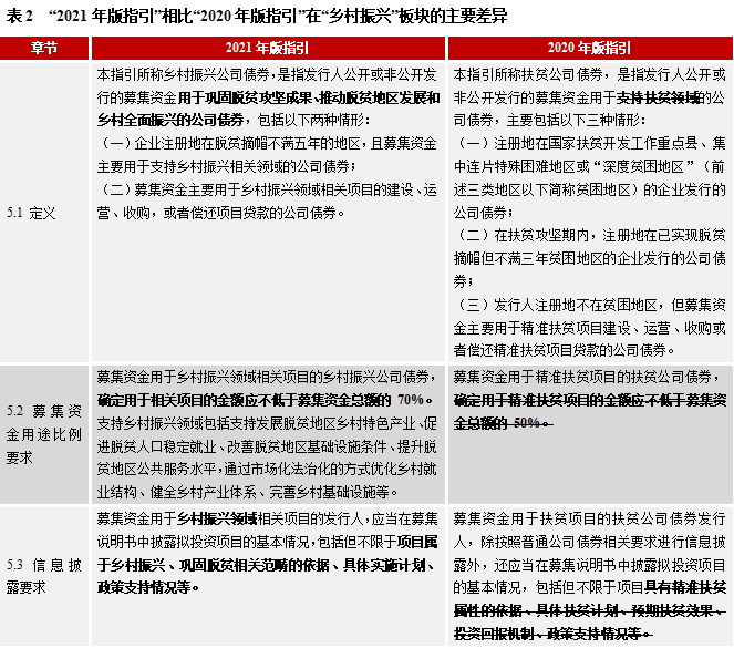 2021年版指引主要修訂以下內(nèi)容:一是給出鄉(xiāng)村振興公司債券的發(fā)行要求,即企業(yè)注冊(cè)地在脫貧摘帽不滿五年的地區(qū),且募集資金主要用于支持鄉(xiāng)村振興相關(guān)領(lǐng)域的公司債券,或主要用于鄉(xiāng)村振興領(lǐng)域相關(guān)項(xiàng)目的建設(shè)、運(yùn)營(yíng)、收購,或者償還項(xiàng)目貸款的公司債券;二是提升資金使用比例,確定用于相關(guān)項(xiàng)目的金額應(yīng)不低于募集資金總額的 70%,較扶貧債券使用比例提升20%;三是明確資金使用范圍,鄉(xiāng)村振興債應(yīng)支持發(fā)展脫貧地區(qū)鄉(xiāng)村特色產(chǎn)業(yè)、促進(jìn)脫貧人口穩(wěn)定就業(yè)、改善脫貧地區(qū)基礎(chǔ)設(shè)施條件、提升脫貧地區(qū)公共服務(wù)水平,通過市場(chǎng)化法治化的方式優(yōu)化鄉(xiāng)村就業(yè)結(jié)構(gòu)、健全鄉(xiāng)村產(chǎn)業(yè)體系、完善鄉(xiāng)村基礎(chǔ)設(shè)施等。