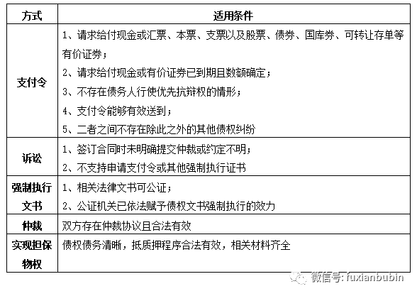 即通過民事訴訟、民商事仲裁、民事督促(支付令)、執(zhí)行公證債權(quán)文書、直接向法院申請實現(xiàn)擔(dān)保物權(quán)的方式,確立債權(quán)的合法性,依靠強(qiáng)制程序收回債權(quán)的清收處置方式。主要適用于債務(wù)人出現(xiàn)生產(chǎn)經(jīng)營陷入困境、財務(wù)狀況嚴(yán)重惡化,債務(wù)履行困難,停止?fàn)I業(yè)或?qū)嶋H控制人下落不明,債務(wù)人還款意愿差,有明顯轉(zhuǎn)移資產(chǎn)或逃廢債務(wù)的行為,主要負(fù)責(zé)人或?qū)嶋H控制人涉及刑事案件等情形。其具體適用情形如下表: