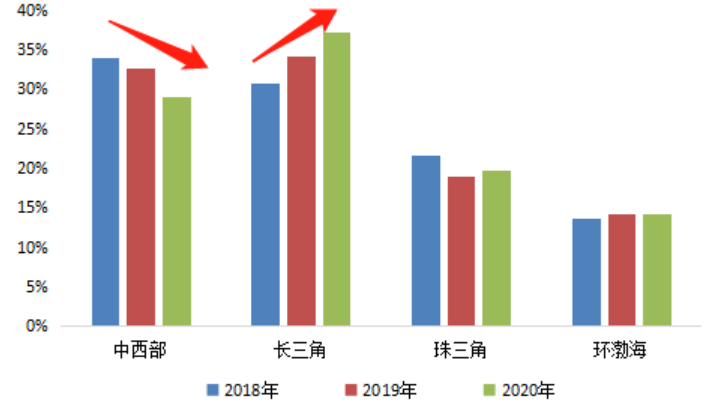 長(zhǎng)三角是國(guó)內(nèi)發(fā)展較為完備的城市群之一,經(jīng)濟(jì)實(shí)力強(qiáng)勁、城市發(fā)展相對(duì)均衡,三四線城市優(yōu)勢(shì)明顯,擁有較強(qiáng)的購(gòu)買(mǎi)力,同時(shí)新經(jīng)濟(jì)活躍度高、周邊一二線城市紅利輻射強(qiáng),從2018年到2020年,50強(qiáng)房企在三四線城市的拿地中,長(zhǎng)三角占比持續(xù)提升,從2018年的31%提升至2020年的37%。