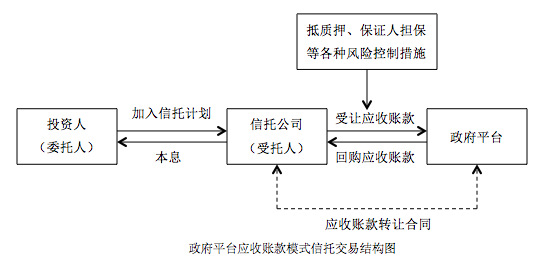 以目前政府平臺融資主要采用的應收賬款轉讓加回購的融資模式為例,信托公司發行信托計劃,募集信托資金,受讓政府融資平臺持有的應收賬款,以該資產未來的現金流作為信托計劃的未來現金流入來源,平臺公司以此融入資金,到期后由其回購應收賬款,實現信托計劃退出。