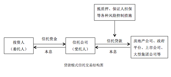 信托公司通過信托計劃向投資人募集資金并向房地產公司、政府平臺、上市公司、大型集團公司等發放貸款,融資方以其關聯資產進行抵質押、保證人擔保等各種風險措施保證債權安全,到期后由融資方還本付息。