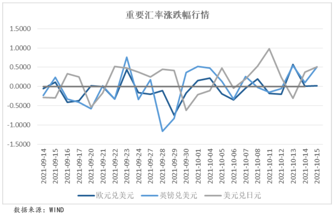 本周,在美元走弱的背景下,歐元和英鎊兌美元均小幅上漲。周內歐元兌美元收于1.1599,周內累計收漲0.23%;英鎊兌美元收于1.3744,周內累計收漲0.90%。本周日元持續疲軟態勢,一是因為市場維持對日本寬松貨幣政策的預期,二是日本發布的經濟報告顯示,受半導體和供應鏈緊張影響,日本國內經濟改善勢頭有所減弱。本周美元兌日元收于114.2550,周內累計收漲1.80%。