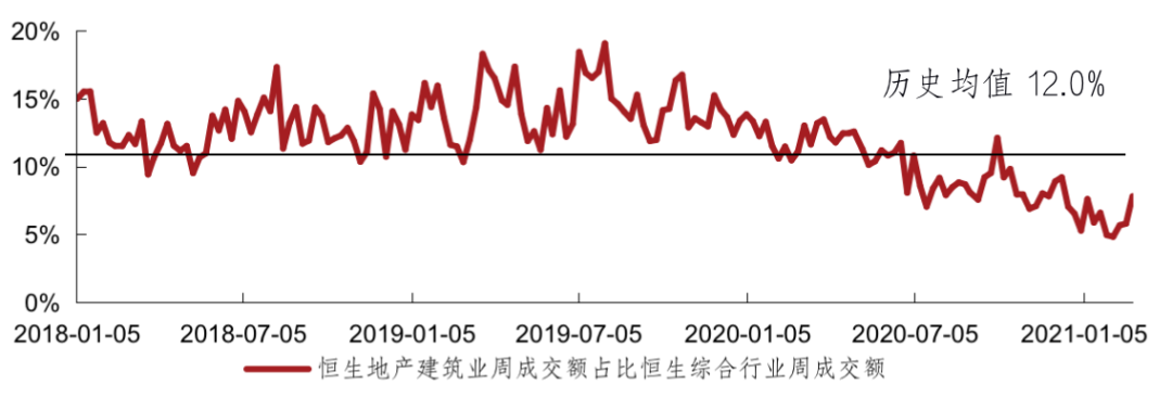 2月恒生地產(chǎn)建筑業(yè)指數(shù)的周均成交額占比