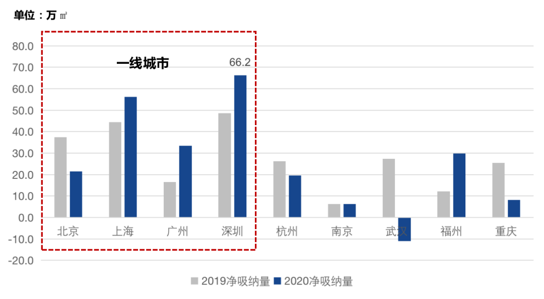 重點二線城市中,武漢受疫情影響最為嚴重,全年凈吸納量為負,杭州與重慶同比下降近3成;南京與去年基本持平,福州受益于三季度整體市場的優(yōu)異表現(xiàn)同比大幅上升。