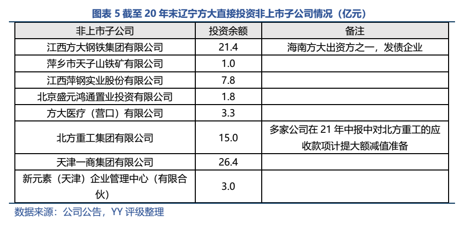 非上市公司部分,截至20年末投資明細(xì)如下(估計(jì)21年上半年未發(fā)生變化)。方鋼集團(tuán)(上市公司方大特鋼的母公司)為發(fā)債企業(yè),截至21年6月末其賬面歸母凈資產(chǎn)218億元,方大集團(tuán)對(duì)其100%持股,母公司報(bào)表采用歷史成本法僅計(jì)入投資額21.4億元,若處置部分股權(quán)能釋放不少資金。其他公司透明度較低,且作為非上市公司,預(yù)計(jì)短期內(nèi)處置變現(xiàn)的難度也較大。