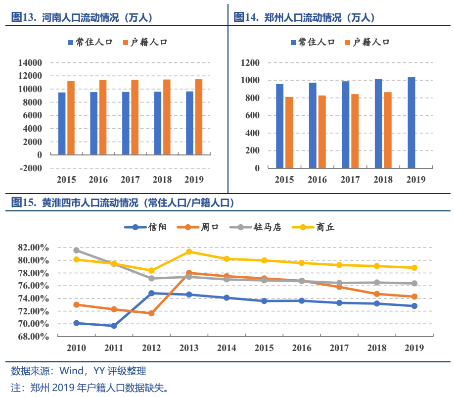 河南的人口體量很大(全國第三),整體處于凈流出的狀態,2019年常住人口比戶籍人口少1,845.78萬人;除了省會鄭州保持相對較大規模的人口凈流入之外,其余大多數地級市均處于人口外流的狀態,且常住人口增長緩慢,特別是渝東南塌陷區的周口、信陽、商丘、駐馬店,這黃淮四市的常住人口占全省常住人口的31%,是省內重要的糧食生產區,但常住人口與戶籍人口的比例均低于80%,且凈流出的趨勢較前幾年更甚,是流出人口的主要來源地。