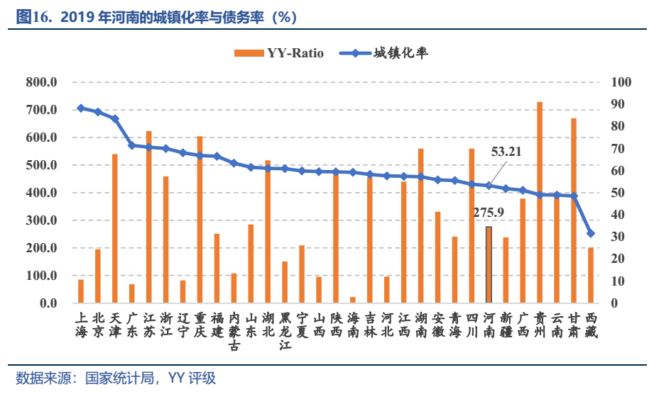 那么未來的河南到底怎么走?回溯過往,千百年來,中原大地鋪滿濃重的農耕底色,農業大省的定位讓其城鎮化率始終處于低水平區間,2017年首次突破50%,而2019年公布的河南城鎮化也僅為53.21%,遠低于全國60%的平均水平,位列倒數第五,未來政府建設、投資的空間較大。在舉債驅動城鎮化發展的模式下,河南相應的債務水平也處于低位線,2019年河南省YY-Ratio為275.9%,從低到高排名全國第十五。