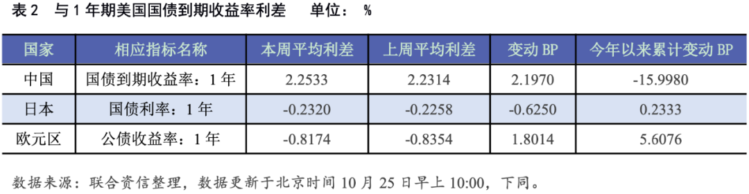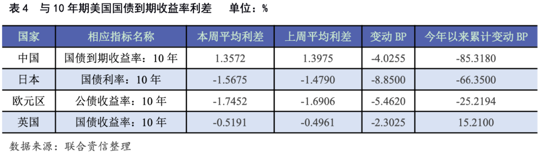 本周各期限中美國債平均收益率利差走勢不一,1年期中美國債平均收益率利差分別較上周走擴2.20個BP至2.25%;5年期和10年期中美國債平均收益率利差分別較上周收窄4.26個和4.03個BP至1.68%和1.36%。本周1年期、5年期和10年期日美國債平均收益率利差分別較上周走擴0.63個、10.20個和8.85個BP至-0.23%、-1.27%和-1.57%。本周1年期歐元區公債與相應期限美債平均收益率利差分別較上周收窄1.80個BP至-0.82%;5年期和10年期歐元區公債與相應期限美債平均收益率利差分別較上周走擴3.77個和5.46個BP至-1.63%和-1.75%。本周5年期英美國債平均收益率利差分別較上周收窄2.54個BP至-0.33%;10年英美國債平均收益率利差分別較上周走擴2.30個BP至-0.52%。