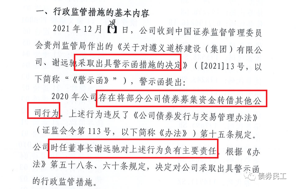 1、根據(jù)遵義道橋建設(shè)(集團)有限公司(以下簡稱“遵義道橋”)于2022年1月4日披露的公司公告(公告蓋章日期為2021年12月31日),因為在2020年存在將部分公司債券募集資金轉(zhuǎn)借其他公司的行為,被貴州證監(jiān)局采取出具警示函措施。公告中未披露遵義道橋轉(zhuǎn)借債券募集資金涉及的具體債券名稱情況。
