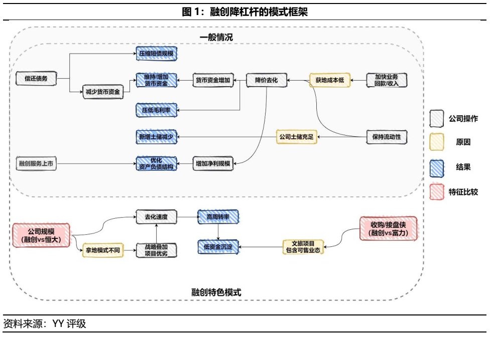 如圖1,根據(jù)融創(chuàng)的財務相關數(shù)據(jù)整理出上方的“一般情況”,并結合與富力和恒大的比較匯總下方“融創(chuàng)特色模式”的降檔成功原因。其中,融創(chuàng)具備了“獲地成本低(收購特殊機會項目)”、“土儲充足(具備2020年減少拿地的資質(zhì))”、“拿地模式不同(收購鎖定核心區(qū)位并結合去化速度,加快非剛需樓盤的高周轉)”和“文旅項目具可變現(xiàn)性(資金沉淀小)”等。