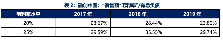 若以上述調(diào)整指標作為衡量基礎,分別以毛利率20%-25%對融創(chuàng)的權益口徑銷售額/有息負債指標進行換算,則可得下表。