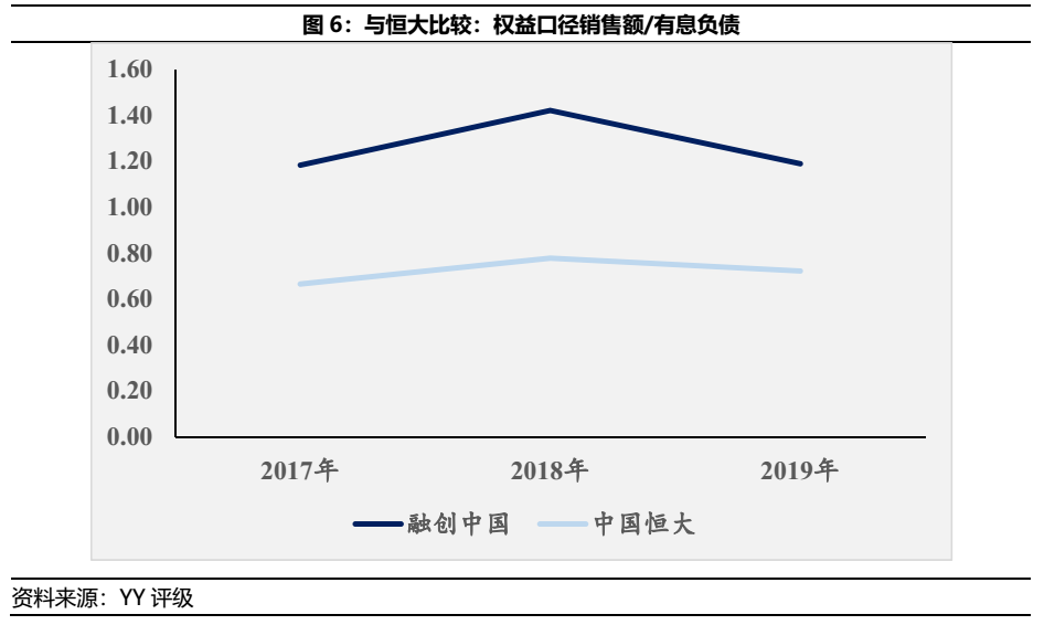 而從有息債務撬動權益口徑的銷售額來看,亦能發(fā)現(xiàn)恒大的債務效能明顯弱于融創(chuàng)。若再將權益口徑銷售額乘以25%(房企一般的毛利率水平)作為回款假設,則恒大的權益口徑毛利/有息負債僅為16%-19%之間,甚至不足19-20年恒大在外借款的非標利率水平。