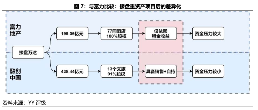 富力耗資199.06億元接盤了萬達77間酒店,融創(chuàng)則花費438.44億元接盤了13個文旅項目,他們自此有了不一樣的未來。自該收并購方案來看,富力看似狠賺老王一百多個小目標(最初酒店收并購方案的對價為300多億元)的接盤局下,最后卻沒能從重資產(chǎn)資金沉淀的泥淖走出,其中的癥結點仍在于重資產(chǎn)項目的配套住宅,即項目的可售/可變現(xiàn)程度。