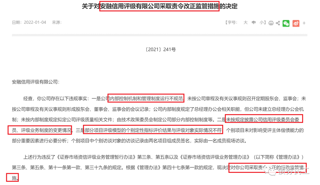 根據(jù)北京證監(jiān)局2022年1月4日的公開信息,安融信用評級有限公司(以下簡稱“安融評級”)因為內(nèi)部控制機制和管理制度運行不規(guī)范、未按規(guī)定披露公司信用評級委員會委員及評級業(yè)務制度的變更情況、部分項目評級模型的個別定性指標評價結果與評級對象實際情況不符等原因,被證監(jiān)局采取責令改正監(jiān)管措施,成為2021年最后一家被監(jiān)管機構采取監(jiān)管措施的評級機構。