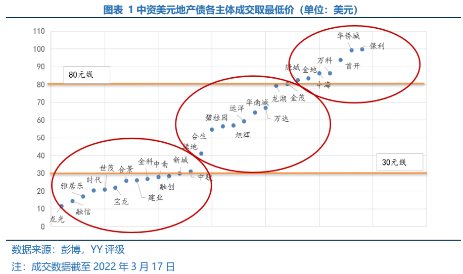 以境外美元債為例,尚未正式違約的主體,截至3月17日,最低價30元以下的主體包括展期的龍光,世茂以及融信、時代等,融創、新城同樣在30元附近掙扎。碧桂園、旭輝、混改的遠洋、綠地分布在30-60元間,民企龍頭龍湖與多數央國企最低價在80元以上。