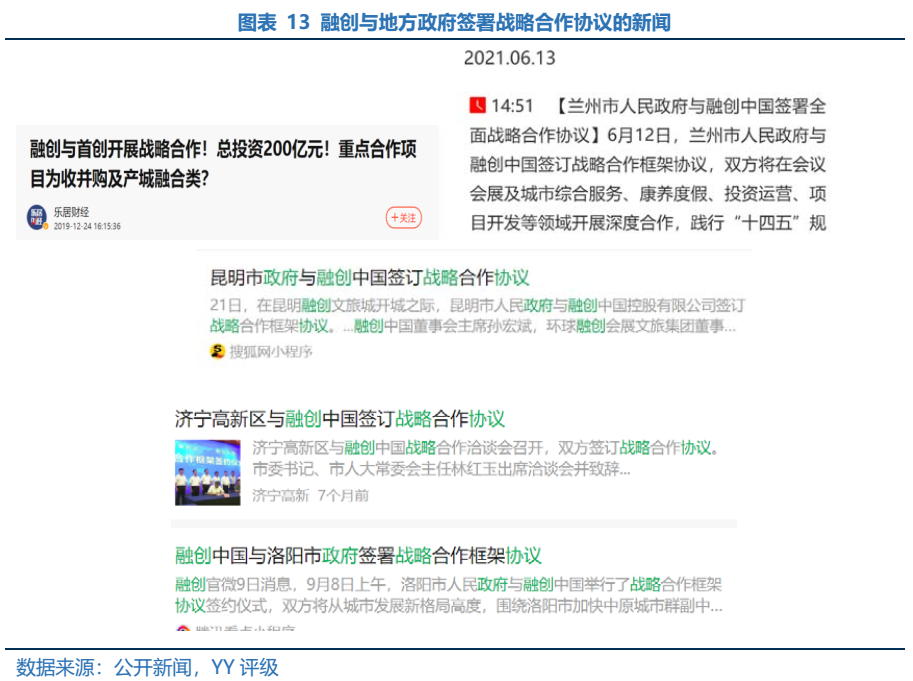 05 與地方國企合作較密切,影響范圍更廣。融創近年來土儲權益比在下滑,市場討論較多的也是其與地方國企合作更為密切,通過聯合營放大經營杠桿,借助合作方的力量鋪開規模,占據市場,獲得更多當地資源支持。根據公開新聞,融創與包含昆明、蘭州、洛陽、三亞、桂林等多地政府簽署戰略合作框架的次數要遠高于碧桂園、龍湖等企業,側面反映其與地方的關聯度較深。另一方面也解釋了融創向央行尋求支持的行為。