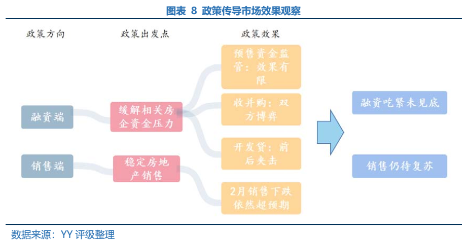 通過我們的分析,政策將會繼續在“房住不炒”定調下,從對市場有利的角度出發,針對房企的銷售端、融資端出臺相關政策。基于政策推動下政策的傳導路徑,地產融資根本性改善最終還是取決于銷售的實質性扭轉。