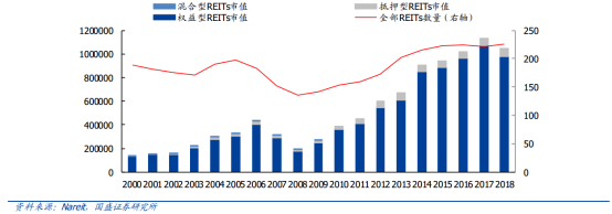 美國是全球最早發(fā)展REITs的國家,1960年美國《國內(nèi)稅收法案》和《房地產(chǎn)投資信托法案》明確了REITs的稅收結(jié)構(gòu)與法律框架,1965年,首只REITs于紐交所上市,標(biāo)志著REITs市場的啟動。隨著政府允許滿足條件的REITs免征所得稅和資本利得,REITs得到快速的發(fā)展,如今美國的REITs市場已經(jīng)發(fā)展的很成熟了,這種成熟不僅體現(xiàn)在產(chǎn)品的設(shè)計、操作流程和信息披露,也體現(xiàn)在與REITs市場相對應(yīng)的法律框架的完備上。目前已經(jīng)超過30個國家引進REITs制度并形成交易市場。截至3月末,美國上市REITs共225只,市值合計1.216萬億美元。