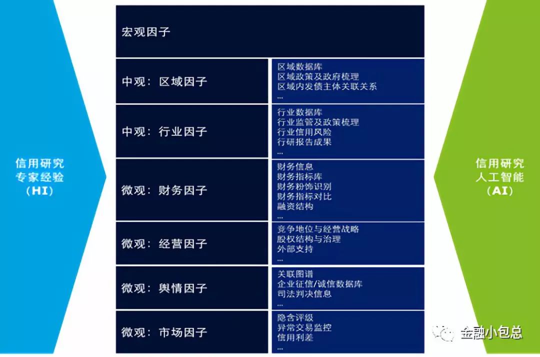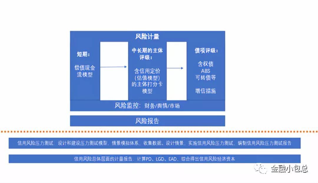 內(nèi)評體系化建設(shè)的核心落腳點(diǎn)在于提升團(tuán)隊(duì)的風(fēng)險識別、風(fēng)險計量、風(fēng)險緩釋及處置能力。風(fēng)險識別是信用風(fēng)險評估入口的問題,風(fēng)險計量是信用風(fēng)險評估出口的問題。信用風(fēng)險的評估環(huán)節(jié)入口應(yīng)綜合專家經(jīng)驗(yàn)和人工智能兩套方法論,而信用評估的出口環(huán)節(jié)精細(xì)化信用研究成果如下圖所示: