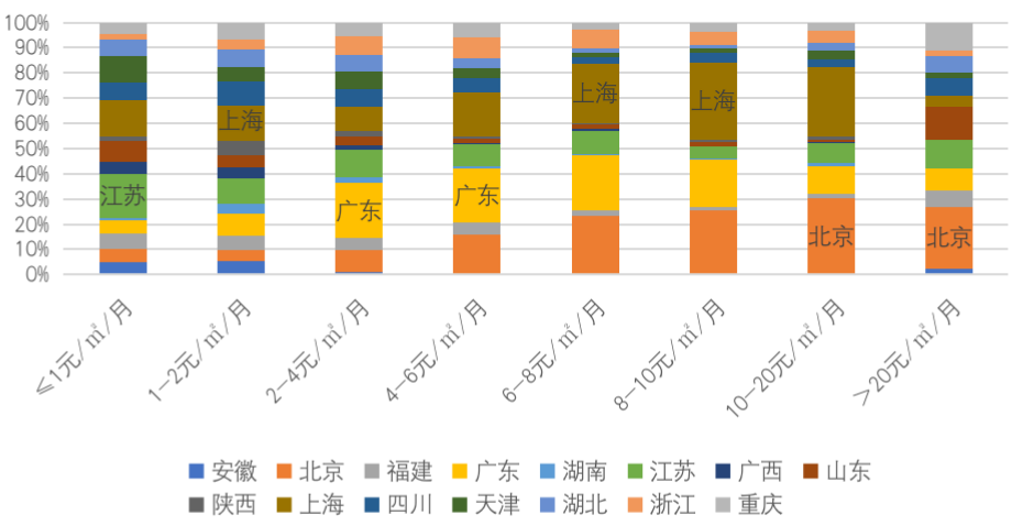 與此同時,由于上海、北京等一線城市經濟發展水平高,居民物業費接受度、接受能力高,6元/㎡/月以上的各價格段的最高占比均被上海、北京包攬,且價格段越高,上海、北京等一線城市占比越高。