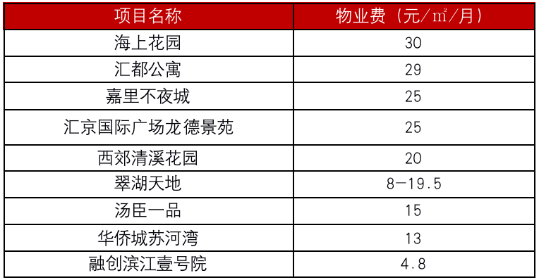 以上海為例,在傳統認知中,翠湖天地、湯臣一品、華僑城蘇河灣、融創濱江壹號院等項目均是上海高端住宅,但其物業費均不超過20元/㎡/月。