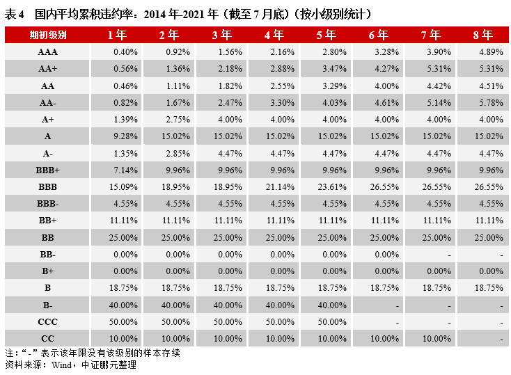 依照上述處理方法,我們按大級別和小級別兩類分別統(tǒng)計了2014-2021年的平均累積違約率,大級別違約率用于觀察違約率從高級別到低級別的整體分布概況,小級別違約率用于觀察子級別間的違約率差異。并對比穆迪全球的平均累積違約率數(shù)據(jù),從而觀察出我國的違約率特征(注:我國數(shù)據(jù)和穆迪全球數(shù)據(jù)的統(tǒng)計年度不完全重疊,兩者經(jīng)歷的經(jīng)濟周期不同,會對違約率產(chǎn)生一定的影響,本文假設這種影響較小,暫且忽略該因素對最終違約率的影響)。