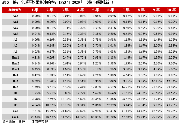 3.低級別違約率提示評級下調(diào)較為滯后。低級別(A及以下)的樣本有兩個特征:一是因為樣本不足,相鄰級別間違約率跳躍性很大;二是因為國內(nèi)下調(diào)級別相對滯后,下調(diào)至B-、CCC級后基本違約率就極高了,且違約均發(fā)生在下調(diào)后的一年內(nèi)。而對比穆迪全球的數(shù)據(jù),即使下調(diào)至Caa級,也需要累積10年違約率才到50%水平,而國內(nèi)僅需1年。