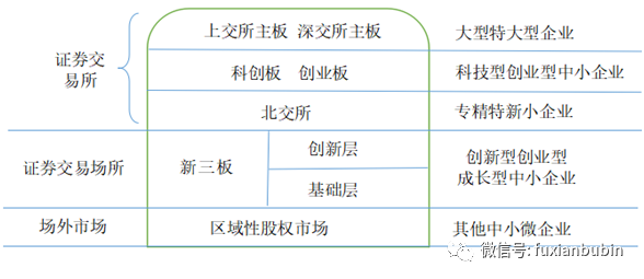 從企業數量和規模上來區分,常用金字塔來形容我國多層次資本市場結構:區域性股權市場為塔基,區域性市場、場外市場,但其擁有和服務著最海量的中小微企業;新三板為塔中,全國性證券交易場所、場內市場,服務廣大的創新型創業型成長型中小企業,承擔承上啟下的重任;京滬深三交易所為塔尖,服務企業相對較少,但企業相對已很成熟。如果根據市場的重要性來看,又是一個倒金字塔結構,塔尖對我國經濟的重要性最大。